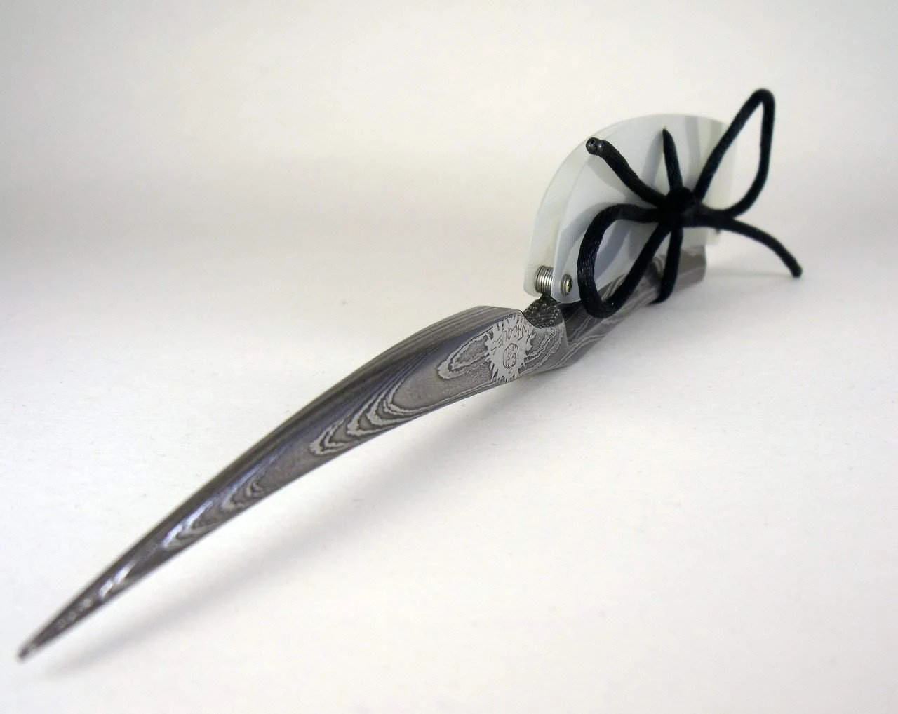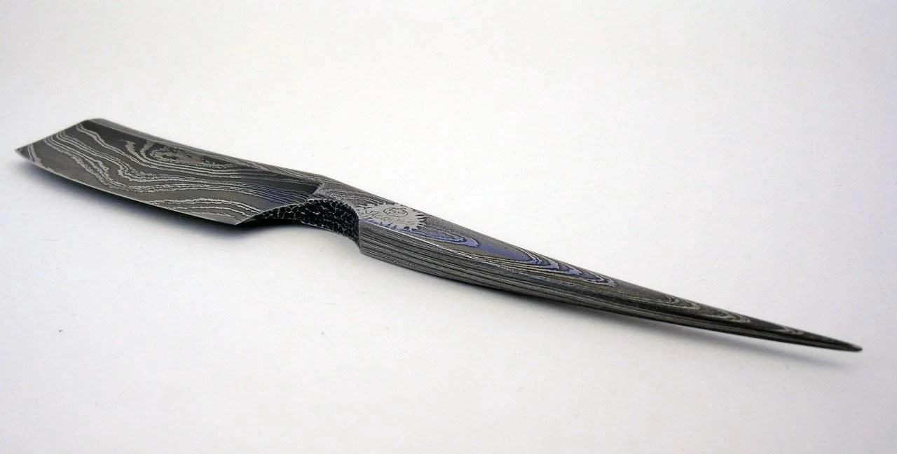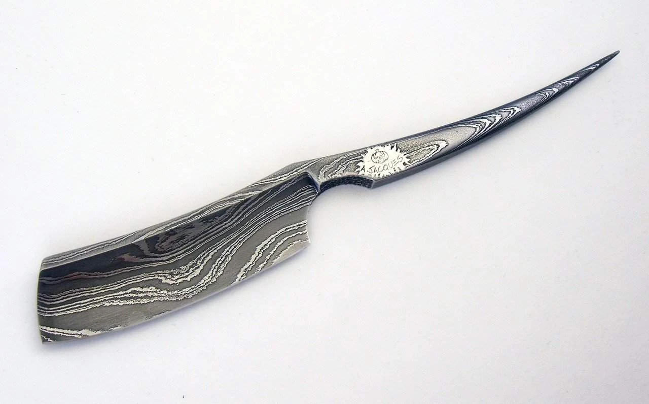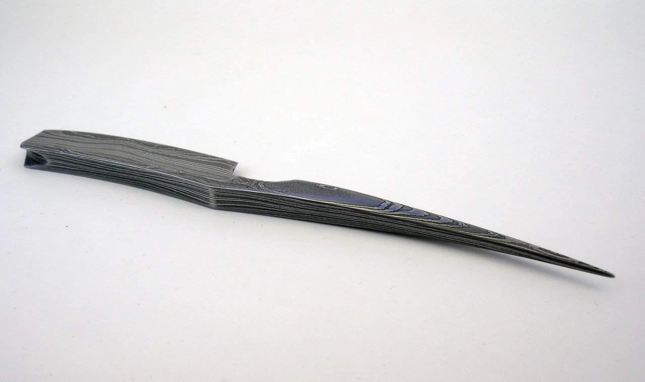-O1/L6 “damascus” steel hardened to HRC 60 giving a long-lasting edge that isn’t impossible to hone