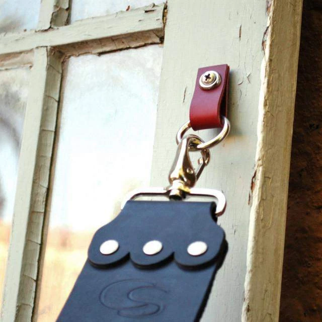Easily installed with one screw and washer (provided), this rugged piece is the perfect solution for strop hanging and storage. Available in mahogany (pictured) or black latigo leather. Choose from pull-down menu above.