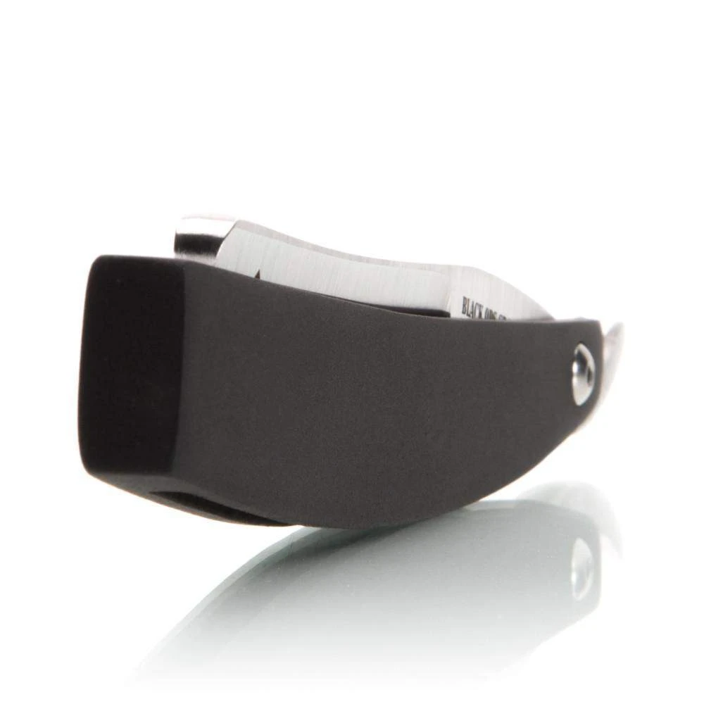 The steel is tested at a Rockwell hardness of 62 – 63, giving your razor the sharpest and most long-lasting edge possible. The one-piece scales have a simple elegance and are extremely durable while providing an excellent balance to the razor’s edge. The scales are attached by a hex screw so the user can easily tighten or loosen to his preference as well as re-scale the razor. The addition of hand carved file jimps on the inside edge of the blade’s tang provide extra grip and control while shaving.