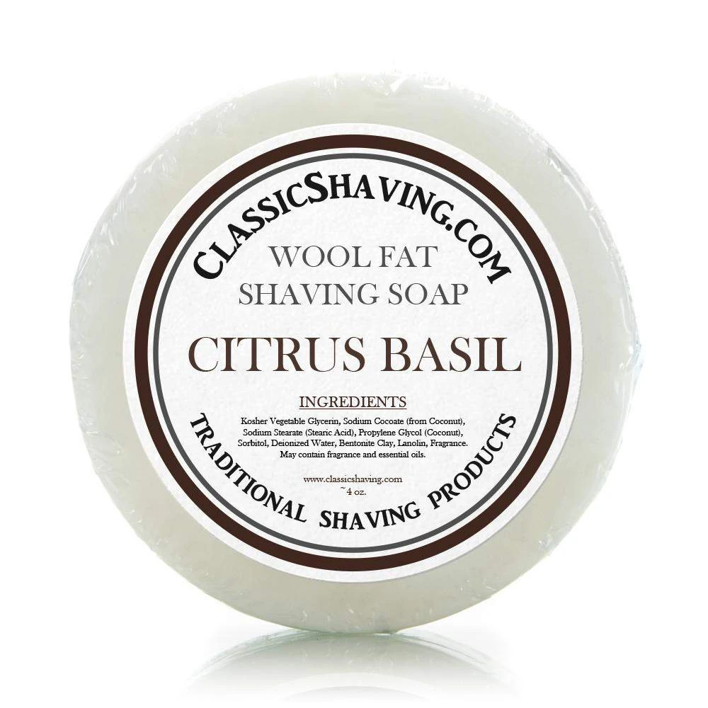 We’re confident that once you’ve used “Classic Brand” Citrus Basil Wool Fat Shaving Soap you will not want to use any other brand. We have been dreaming of a Wool Fat Shaving Soap ever since we read of the benefits of lanolin in skin care and we knew our soap maker in beautiful Northern Idaho was up to the challenge. After much research, formula tweaking and testing, they came up with what we feel is a true gem. This soap is rich and it creates a lather, while not fluffy, is quite silky and your razor will glide across it giving you a nourishing and smooth shave. The 3″ diameter 4 ounce puck is quite dense and should last longer than an average shaving soap. Available in 32 unique scents.