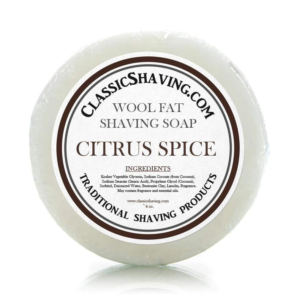 We’re confident that once you’ve used “Classic Brand” Citrus Spice Wool Fat Shaving Soap you will not want to use any other brand. We have been dreaming of a Wool Fat Shaving Soap ever since we read of the benefits of lanolin in skin care and we knew our soap maker in beautiful Northern Idaho was up to the challenge. After much research, formula tweaking and testing, they came up with what we feel is a true gem. This soap is rich and it creates a lather, while not fluffy, is quite silky and your razor will glide across it giving you a nourishing and smooth shave. The 3″ diameter 4 ounce puck is quite dense and should last longer than an average shaving soap. Available in 32 unique scents.