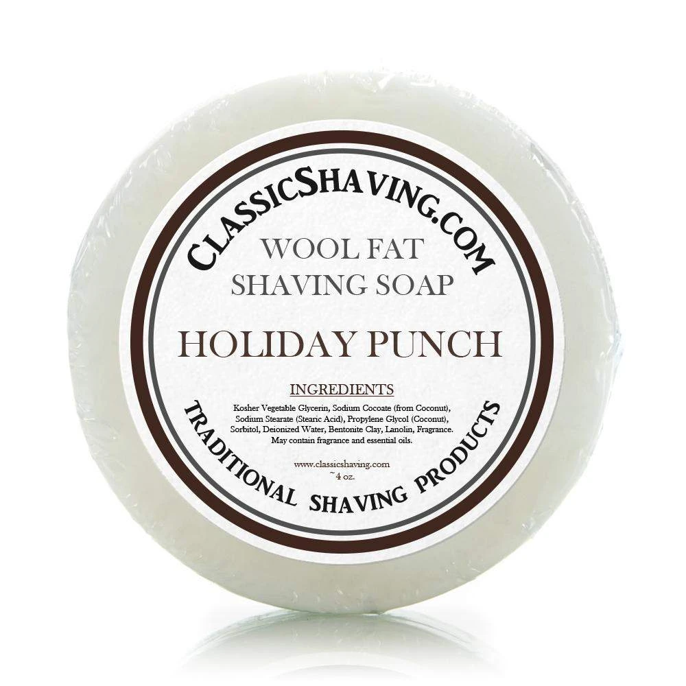 We’re confident that once you’ve used “Classic Brand” Holiday Punch Wool Fat Shaving Soap you will not want to use any other brand. We have been dreaming of a Wool Fat Shaving Soap ever since we read of the benefits of lanolin in skin care and we knew our soap maker in beautiful Northern Idaho was up to the challenge. After much research, formula tweaking and testing, they came up with what we feel is a true gem. This soap is rich and it creates a lather, while not fluffy, is quite silky and your razor will glide across it giving you a nourishing and smooth shave. The 3″ diameter 4 ounce puck is quite dense and should last longer than an average shaving soap. Available in 32 unique scents.