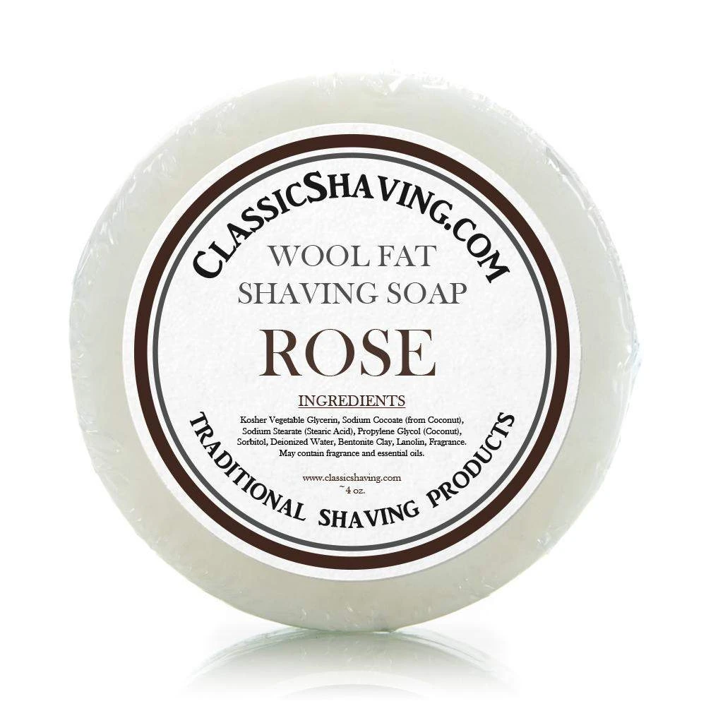 We’re confident that once you’ve used “Classic Brand” Rose Wool Fat Shaving Soap you will not want to use any other brand. We have been dreaming of a Wool Fat Shaving Soap ever since we read of the benefits of lanolin in skin care and we knew our soap maker in beautiful Northern Idaho was up to the challenge. After much research, formula tweaking and testing, they came up with what we feel is a true gem. This soap is rich and it creates a lather, while not fluffy, is quite silky and your razor will glide across it giving you a nourishing and smooth shave. The 3″ diameter 4 ounce puck is quite dense and should last longer than an average shaving soap. Available in 32 unique scents.