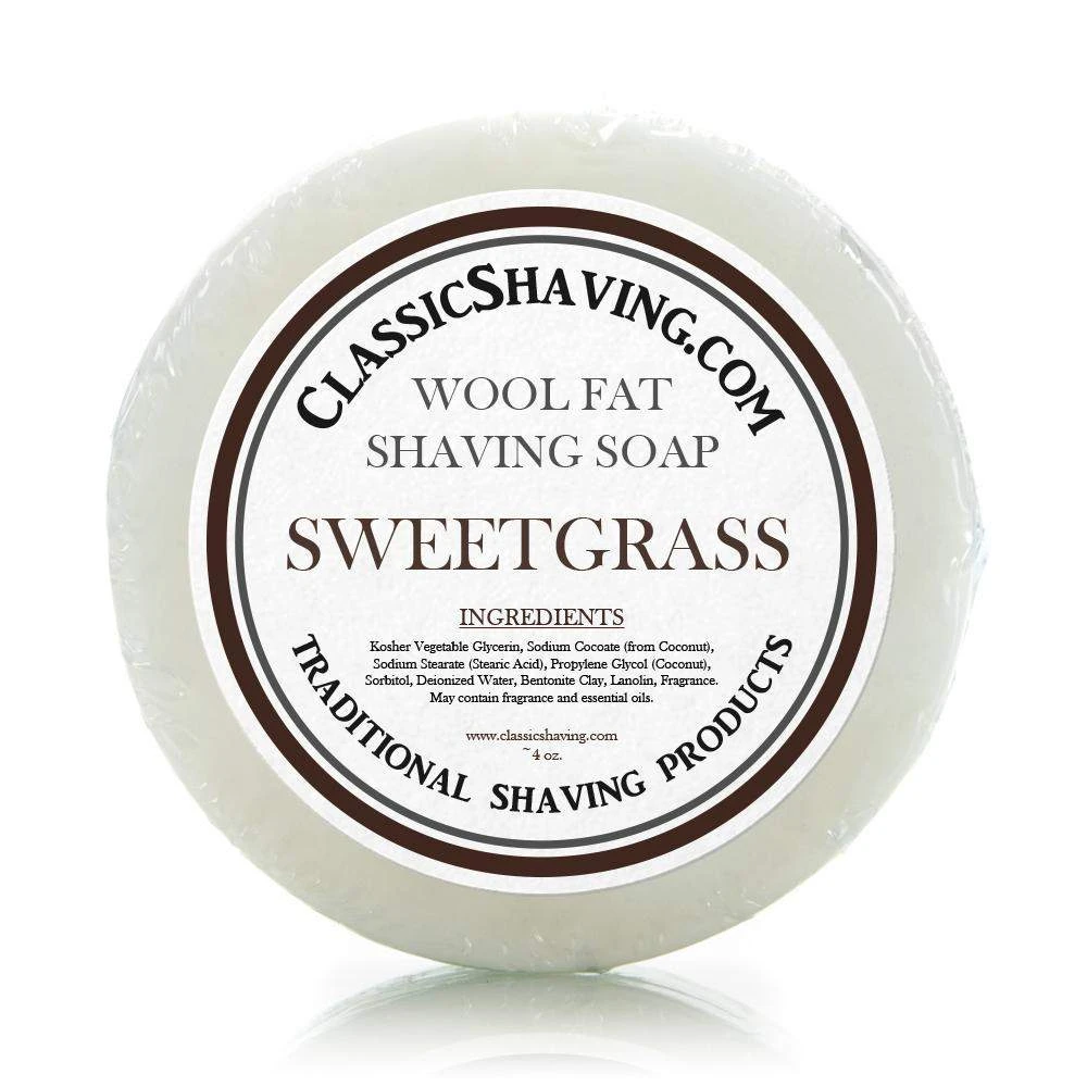 We’re confident that once you’ve used “Classic Brand” Sweetgrass Wool Fat Shaving Soap you will not want to use any other brand.. We have been dreaming of a Wool Fat Shaving Soap ever since we read of the benefits of lanolin in skin care and we knew our soap maker in beautiful Northern Idaho was up to the challenge. After much research, formula tweaking and testing, they came up with what we feel is a true gem. This soap is rich and it creates a lather, while not fluffy, is quite silky and your razor will glide across it giving you a nourishing and smooth shave. The 3″ diameter 4 ounce puck is quite dense and should last longer than an average shaving soap. Available in 32 unique scents.