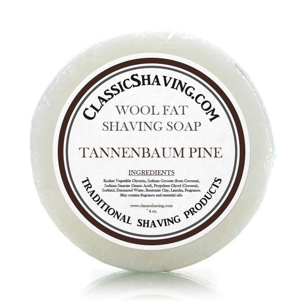 We’re confident that once you’ve used “Classic Brand” Tannenbaum Pine Wool Fat Shaving Soap you will not want to use any other brand. We have been dreaming of a Wool Fat Shaving Soap ever since we read of the benefits of lanolin in skin care and we knew our soap maker in beautiful Northern Idaho was up to the challenge. After much research, formula tweaking and testing, they came up with what we feel is a true gem. This soap is rich and it creates a lather, while not fluffy, is quite silky and your razor will glide across it giving you a nourishing and smooth shave. The 3″ diameter 4 ounce puck is quite dense and should last longer than an average shaving soap. Available in 32 unique scents.