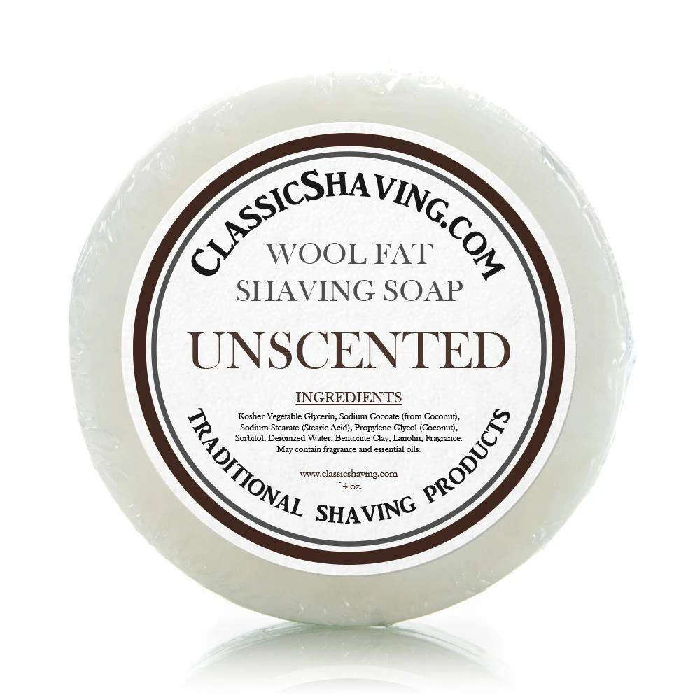 We’re confident that once you’ve used “Classic Brand” Unscented Wool Fat Shaving Soap you will not want to use any other brand. We have been dreaming of a Wool Fat Shaving Soap ever since we read of the benefits of lanolin in skin care and we knew our soap maker in beautiful Northern Idaho was up to the challenge. After much research, formula tweaking and testing, they came up with what we feel is a true gem. This soap is rich and it creates a lather, while not fluffy, is quite silky and your razor will glide across it giving you a nourishing and smooth shave. The 3″ diameter 4 ounce puck is quite dense and should last longer than an average shaving soap. Available in 32 unique scents.