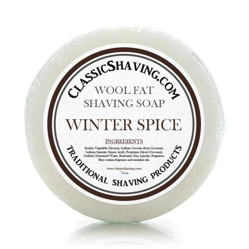 We’re confident that once you’ve used “Classic Brand” Winter Spice Wool Fat Shaving Soap you will not want to use any other brand. We have been dreaming of a Wool Fat Shaving Soap ever since we read of the benefits of lanolin in skin care and we knew our soap maker in beautiful Northern Idaho was up to the challenge. After much research, formula tweaking and testing, they came up with what we feel is a true gem. This soap is rich and it creates a lather, while not fluffy, is quite silky and your razor will glide across it giving you a nourishing and smooth shave. The 3″ diameter 4 ounce puck is quite dense and should last longer than an average shaving soap. Available in 32 unique scents.