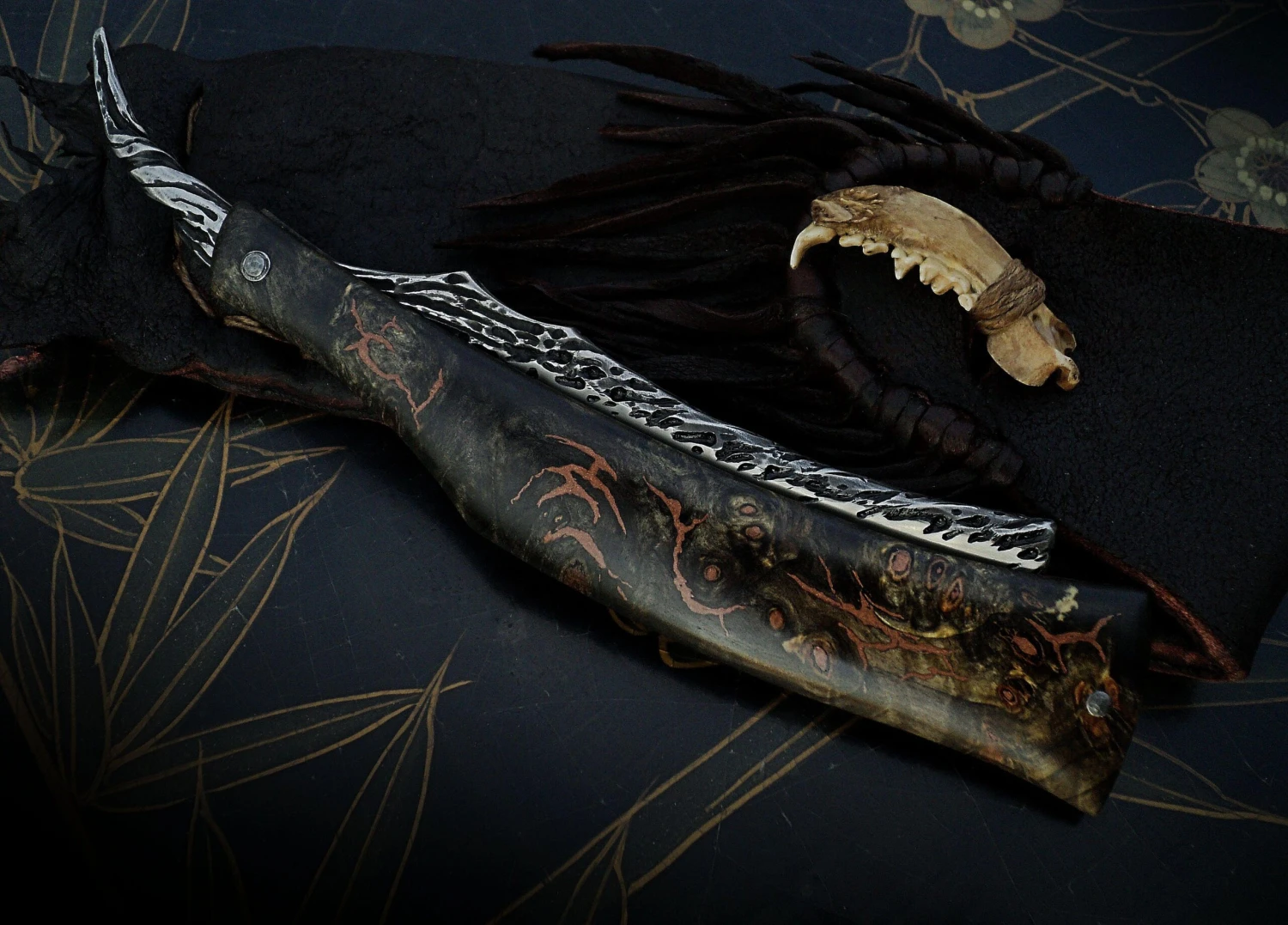 - Stabilized Buckeye Burl Handle with copper/resin inlays