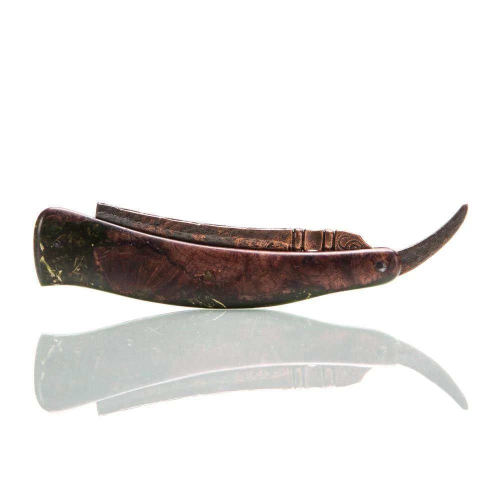– Manzanita burl and green resin handle (with moss and copper powder)