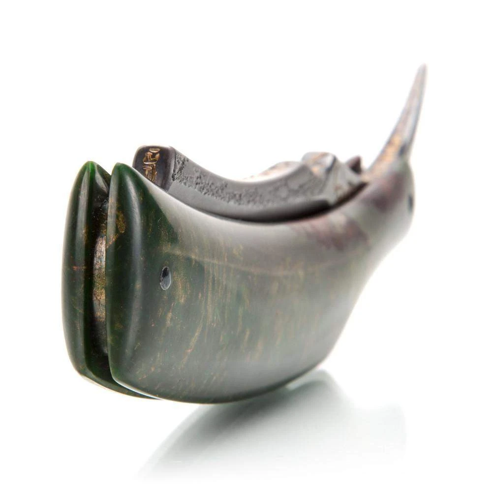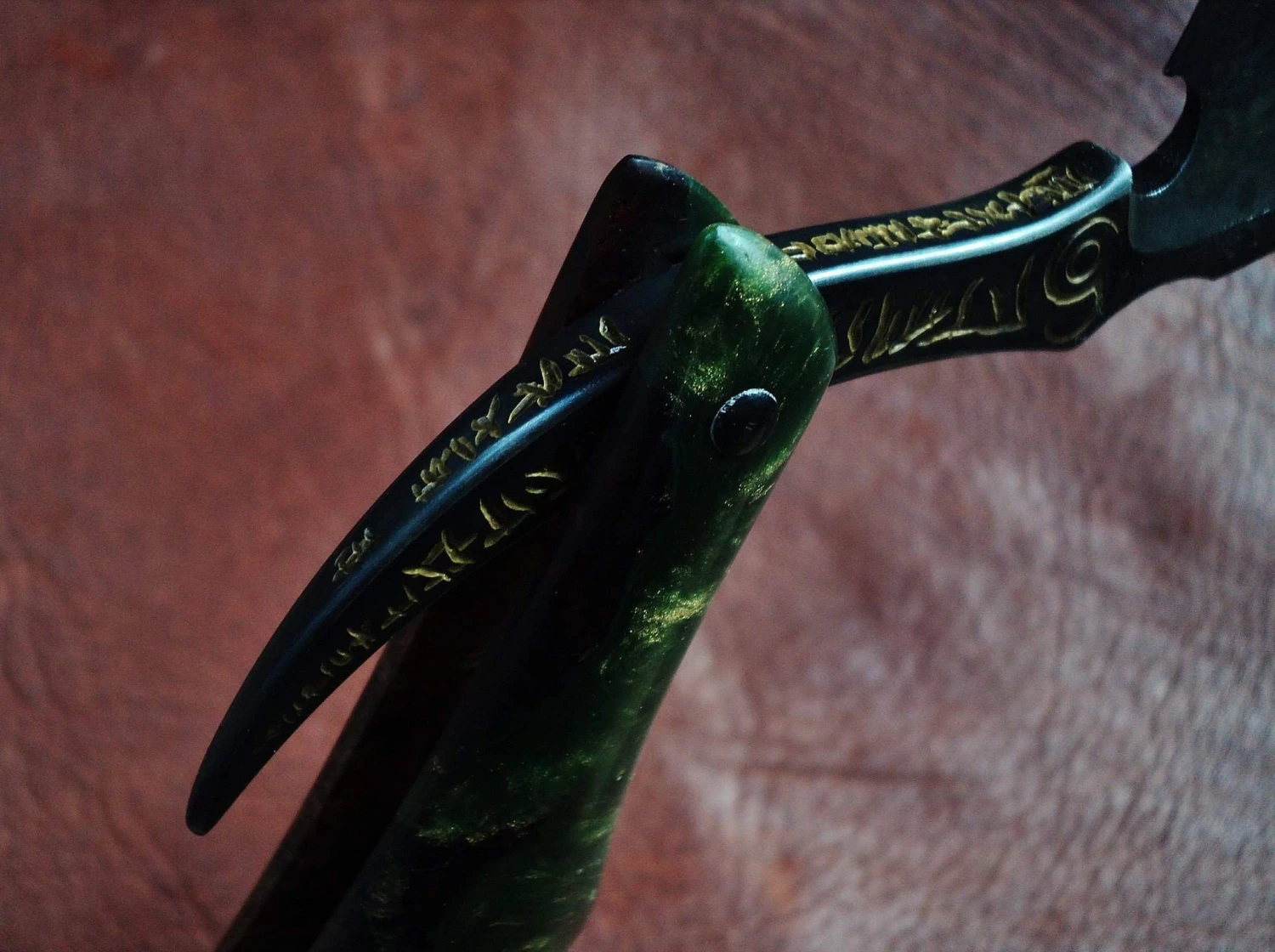 – Handle scales made of green resin with copper powder (and a bit of manzanita burl).