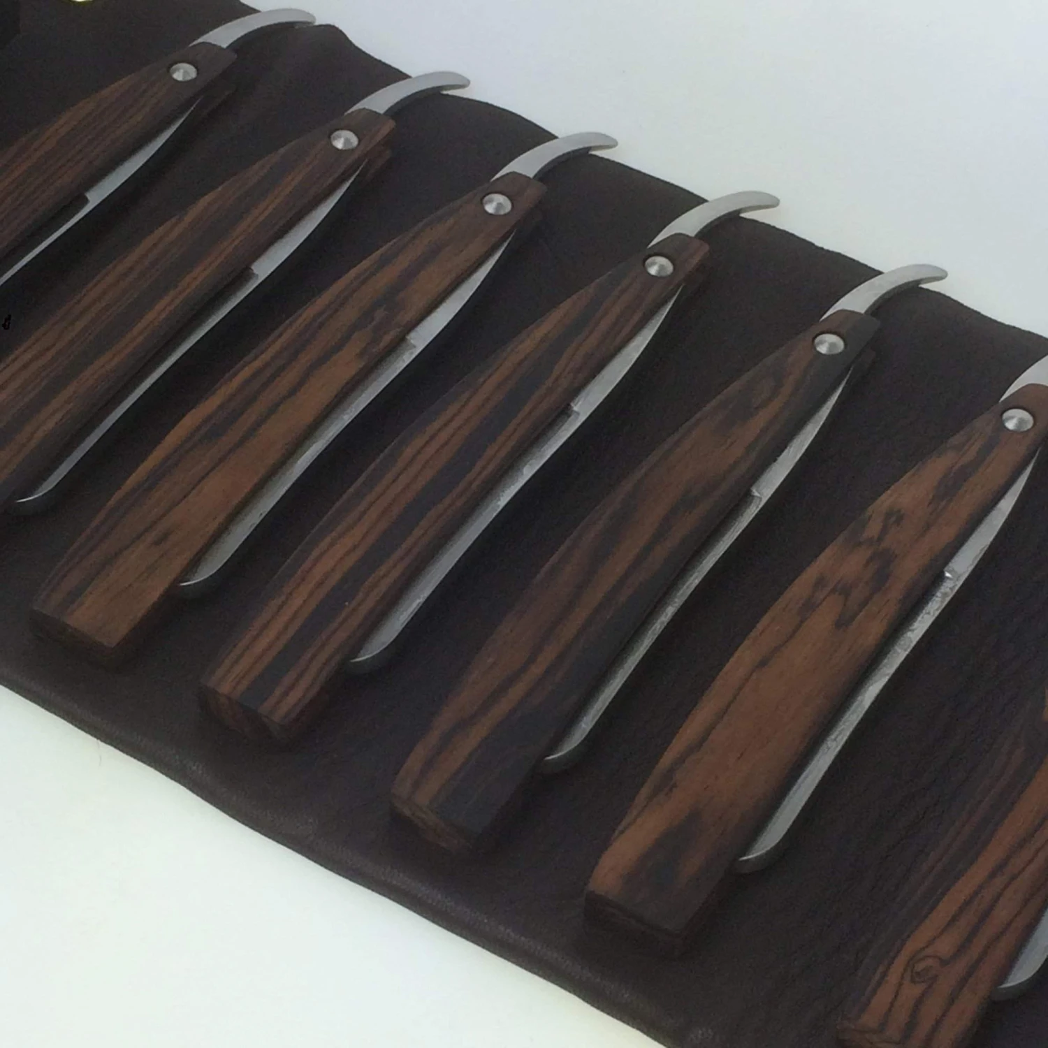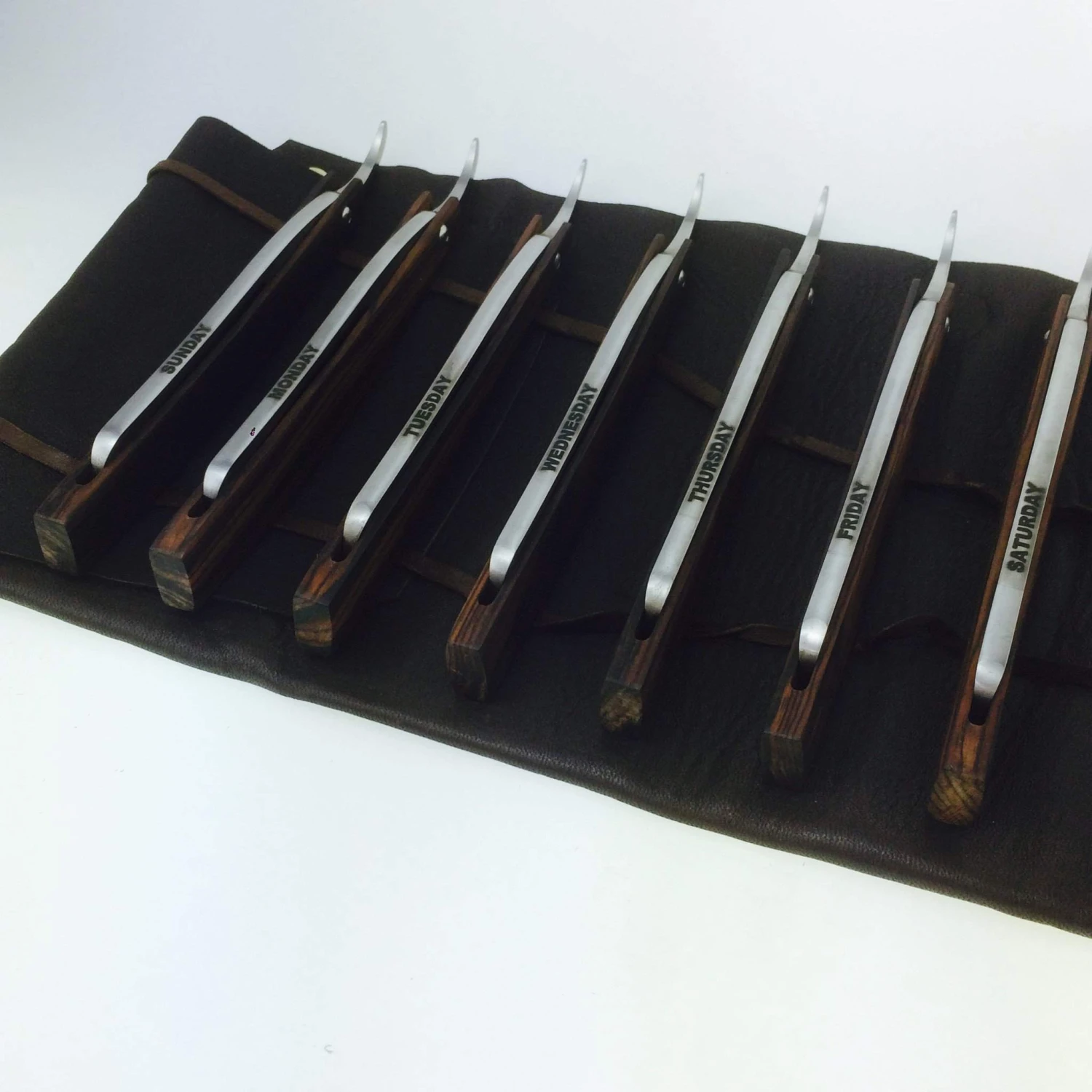 Some die-hard straight razor users find that they benefit and save time and money by maintaining a 7 day set. And what better razor to have seven of than the superiorly crafted, artisan-made Hart Steel? Each razor is hand-engraved with a day of the week on its spine. Set includes a custom 7 razor roll up case, made in the USA in a gorgeous, soft Chocolate Brown deerskin. This new set truly hits the ball out of the park.