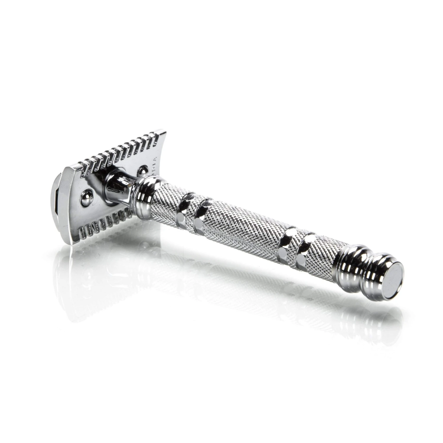 This razor is a heavyweight! It has a Parker design open comb head. (Mekur head on left, Parker designed head on the right). It will stretch the skin to give a nice close shave, whic is why this razor is nicknamed the smooth shaver. This razor has a solid brass frame and textured chrome handle.