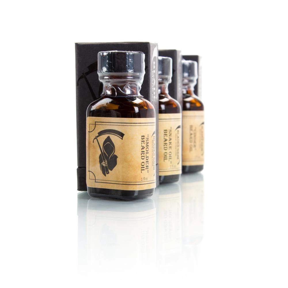A 3 Pack of The Blades Grim – Beard Oil Scents: Smolder, Cinder and Snake Oil (Snake Oil has no fragrance added) each are 1 fluid oz (total of 3 fluid oz) Enjoy a luxurious beard oil with our Blades Grim Smolder, Cinder and Snake Oil Beard Oils. These beard oils will help keep your beard healthy giving it a great shine, texture and smell. This specially crafted beard oil not only treats your beard but the skin underneath. This is the measure of a great beard oil (how well it cares for your skin as well). Just like the hair on your head in order for healthy hair you need to treat the skin and hair follicles.