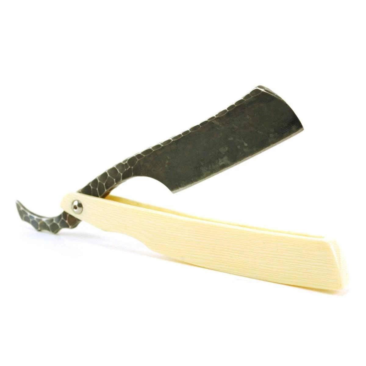 It’s funny who you’ll find literally in your backyard. In our case, it was a straight razor artisan who is ready to break onto the scene in a big way. Up in the mountains of Idyllwild, CA, Dylan Farnham has set up shop. Remember the name, because this guy is the real deal. Not only does he shave with his own straight razor every other day, but get this: when Dylan took a year off to motorbike through South America, he depended on three knives made by his own hand to see him through—a non-folding straight razor, a larger Bowie-esque camp knife, and a Kukri-like machete. All three (four if you count Dylan) returned as good as new and are still in use today. That’s a Dylan Farnham blade: a masterpiece of steel designed to do some serious work. Mixing rugged functionality with a sublime artist’s hand, Dylan’s straight razors are not only built to last for generations, they are aesthetically unlike any we have ever seen. Take a look for yourself. Check out his razors (and soon some of his knives) along with their technical specs on our website. We here at Classic Shaving couldn’t be more proud to welcome Dylan’s line of custom straight razors and knives to our collection. Those of you lucky enough to grab these inaugural razors… enjoy! Farnham customizes a Hart Steel blank to make this beautiful, daily use razor. Here are the specs: – 1/4 inch O-1 Tool Steel – Edge-quenched and tempered to 64-65 Rockwell Hardness – “Stone-age” textured spine and tang. – “Marbled” antique patina – Faux Ivory scales – Stainless hex screw pivot pin