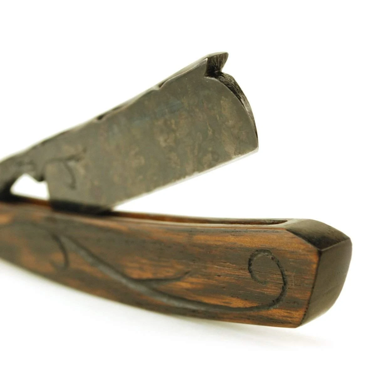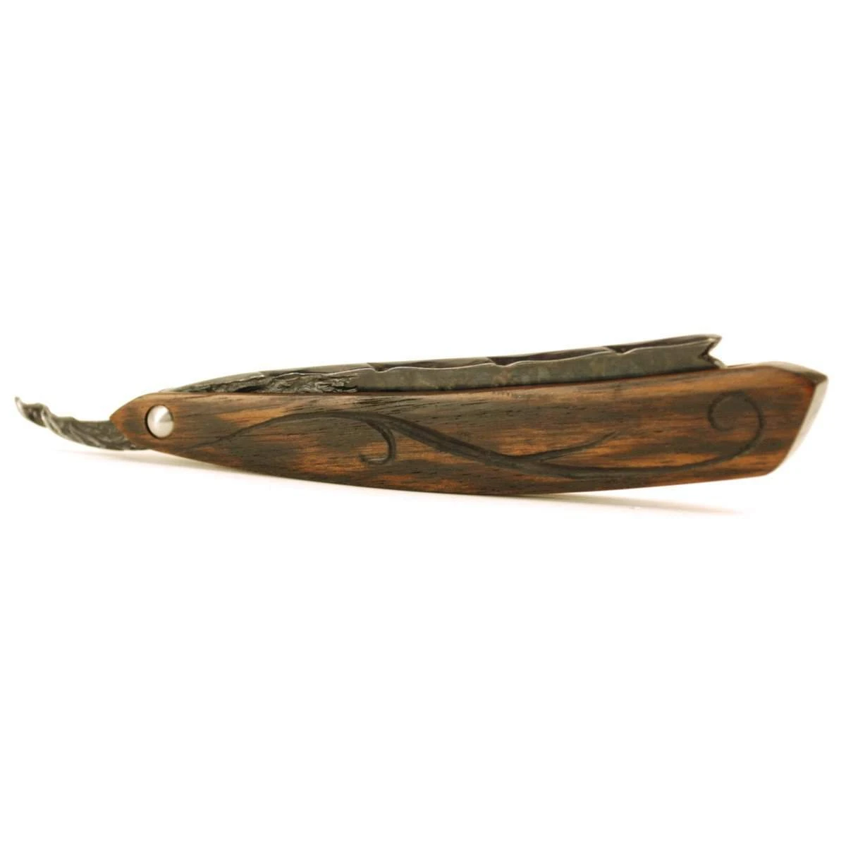 – Rosewood scales, carved with vine pattern and flame-darkened