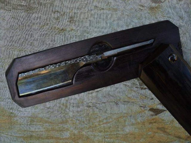 Another mind-crushing kamisori from Dylan Farnham, The Dark Crystal is our new favorite custom. Its tailor-fit storage box has a pivoting lid and the blade itself is nimble and effective.