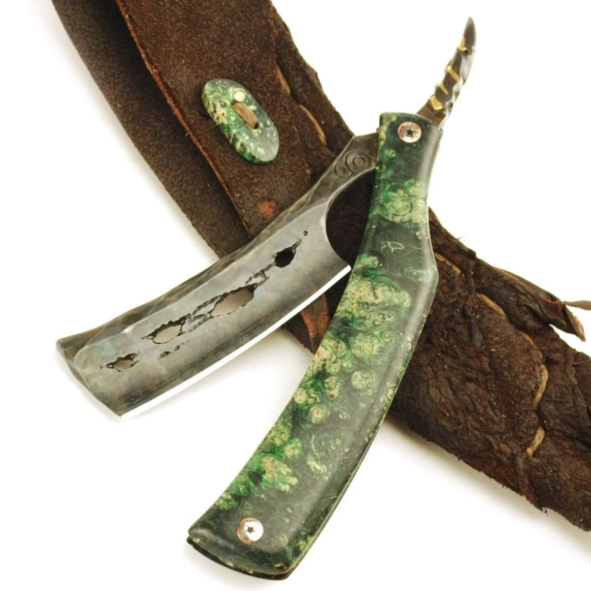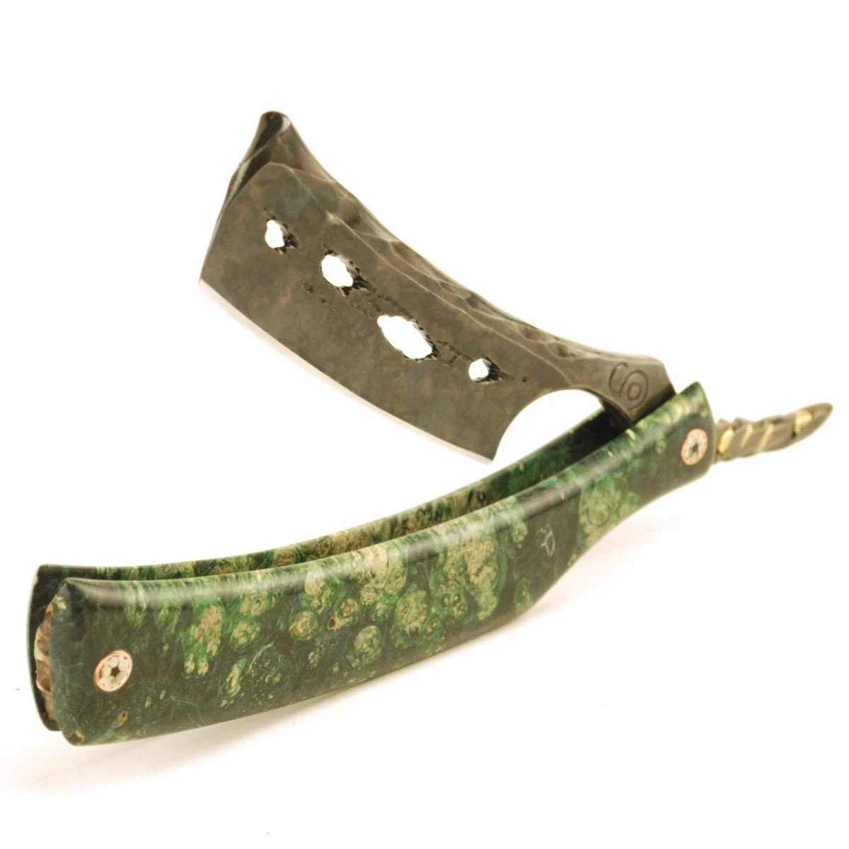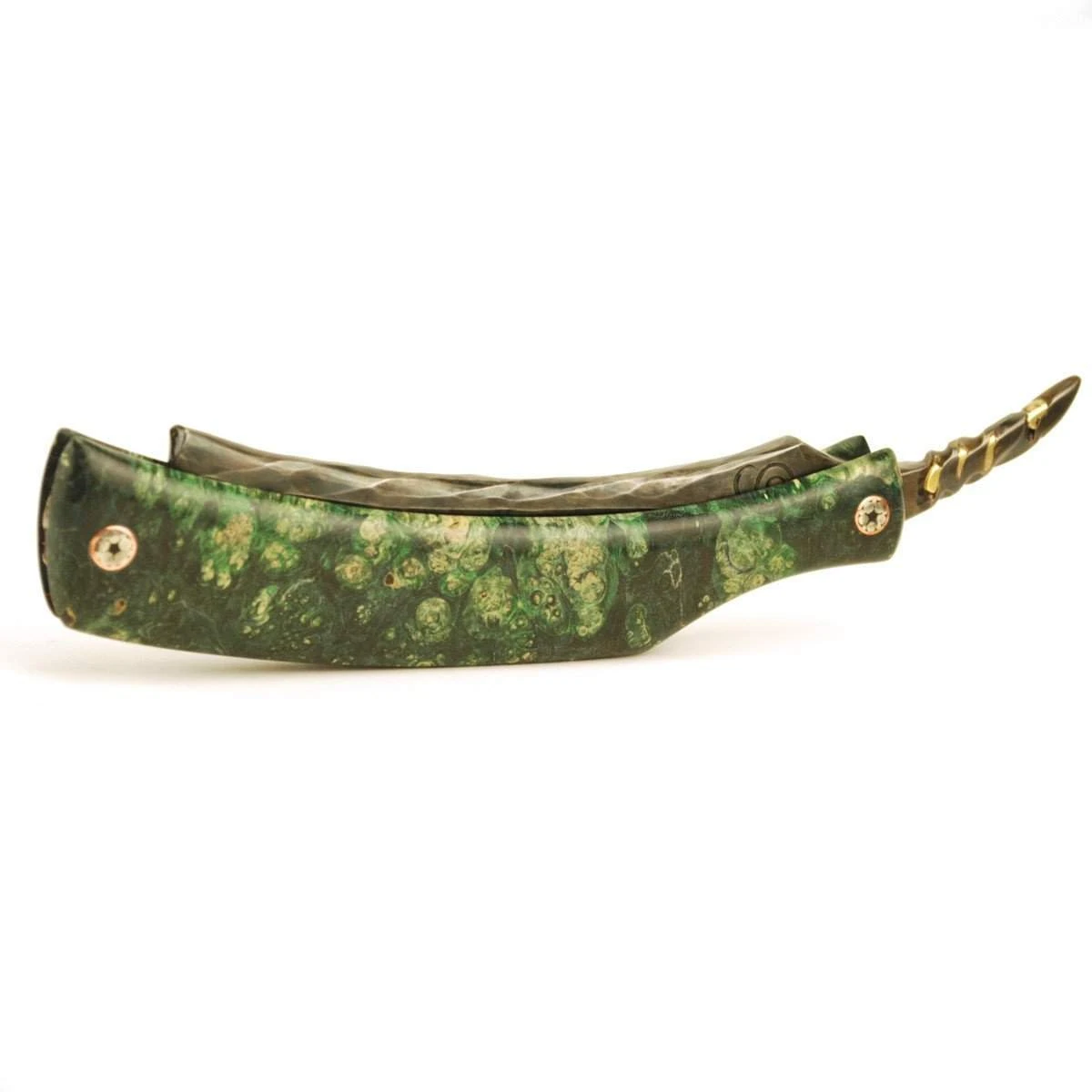 An early morning walk through the cool, dark wood where spring air is beginning to summer. Meet the Lucky Cheshire. Complete with custom elk skin sheath, this razor is as much a showpiece as it is an indispensable tool to be passed down to future generations.