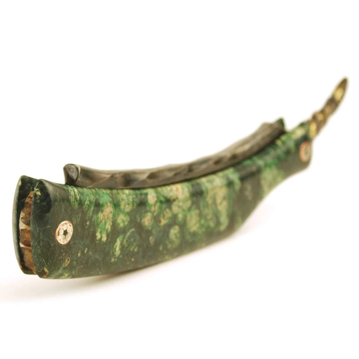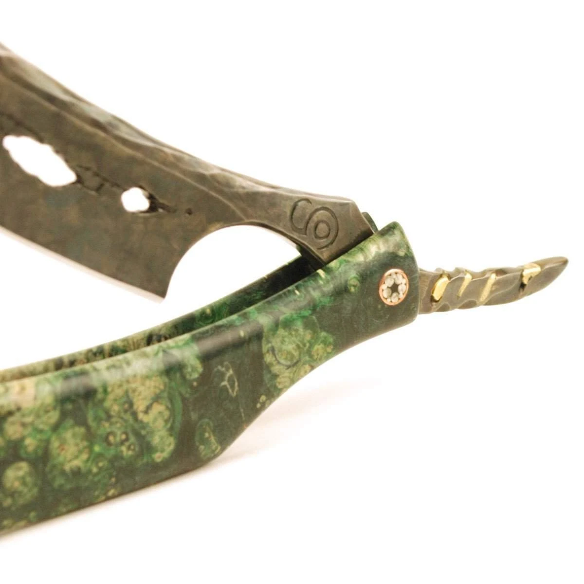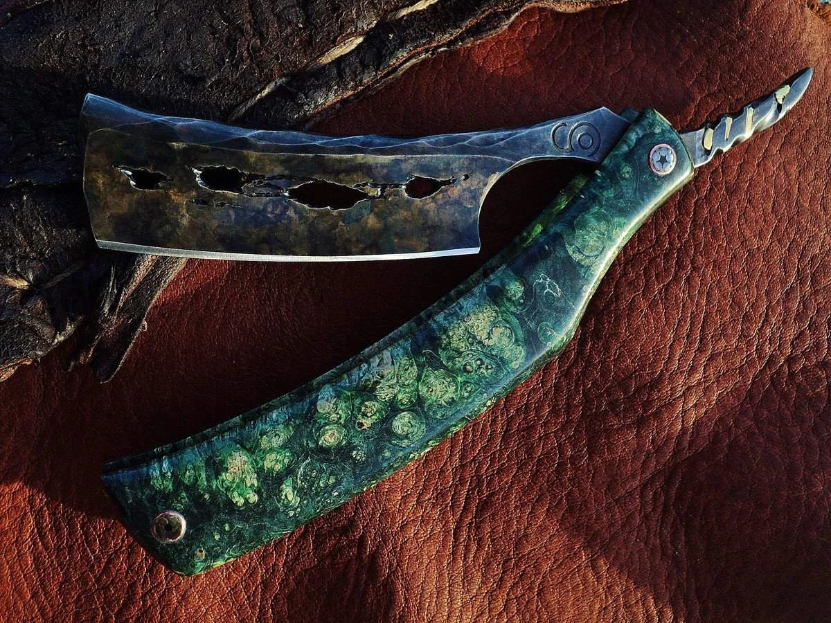 An early morning walk through the cool, dark wood where spring air is beginning to summer. Meet the Lucky Cheshire. Complete with custom elk skin sheath, this razor is as much a showpiece as it is an indispensable tool to be passed down to future generations.