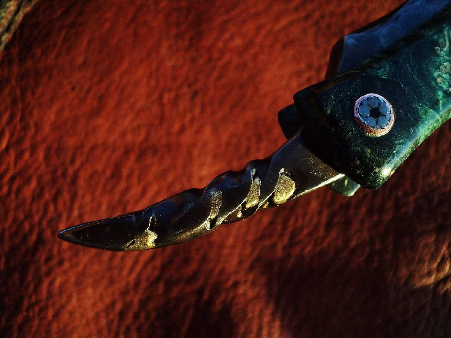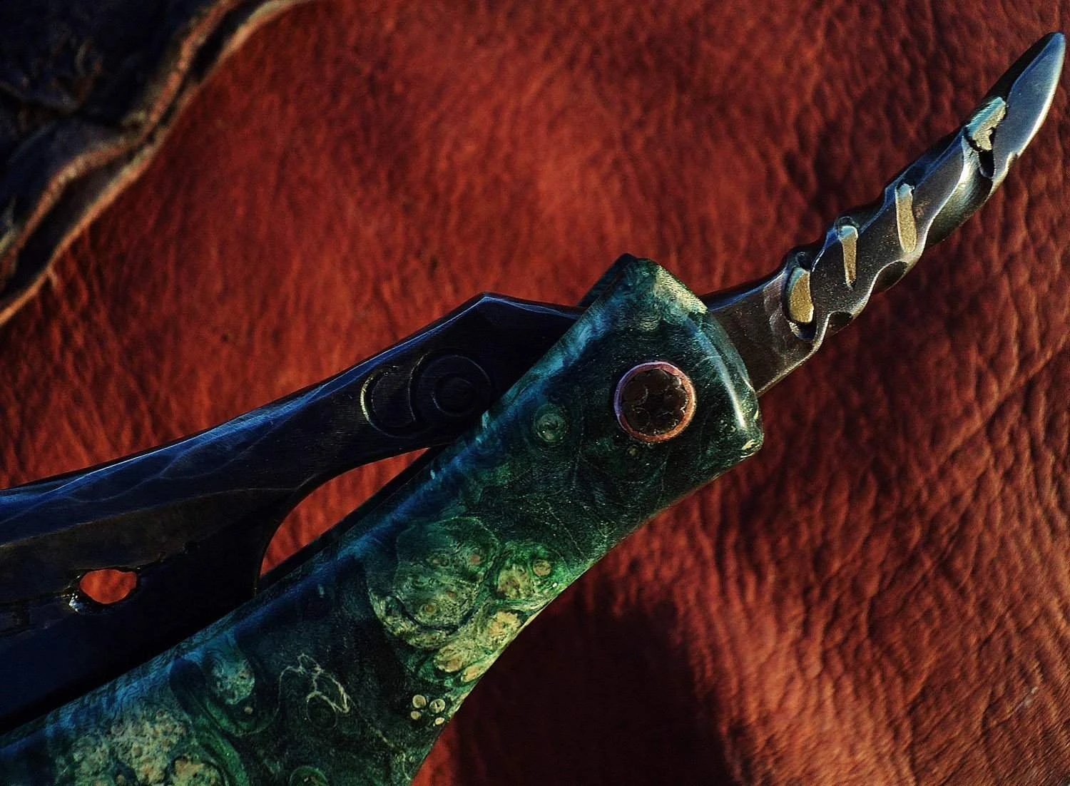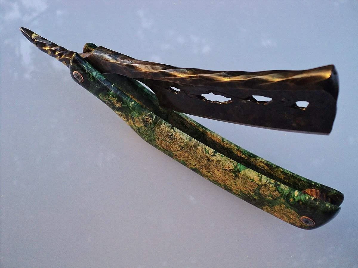 – Polished, stabilized box elder burl handle, dyed blue/green.