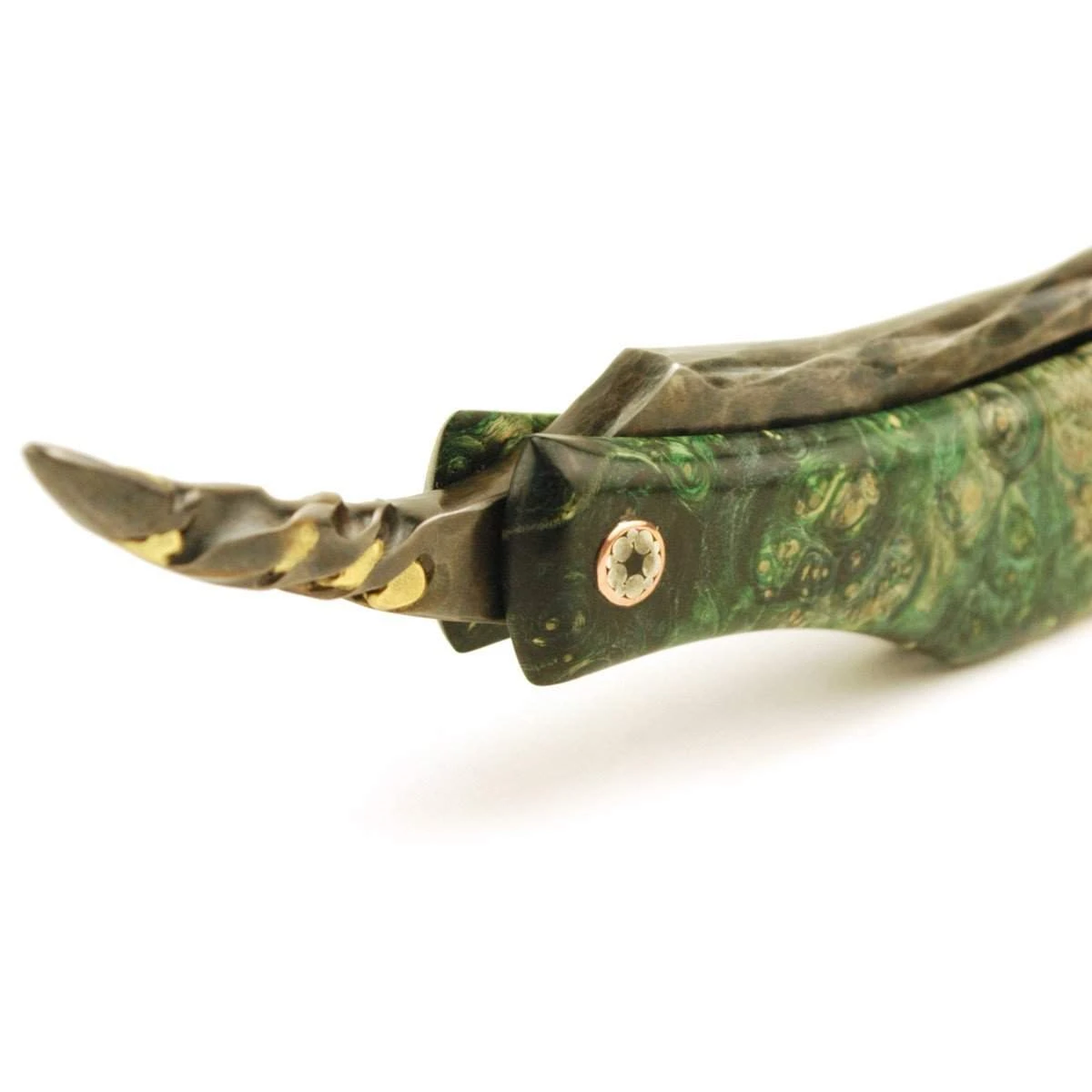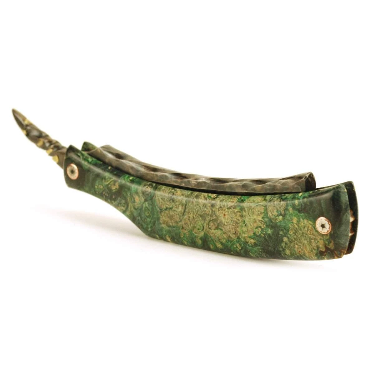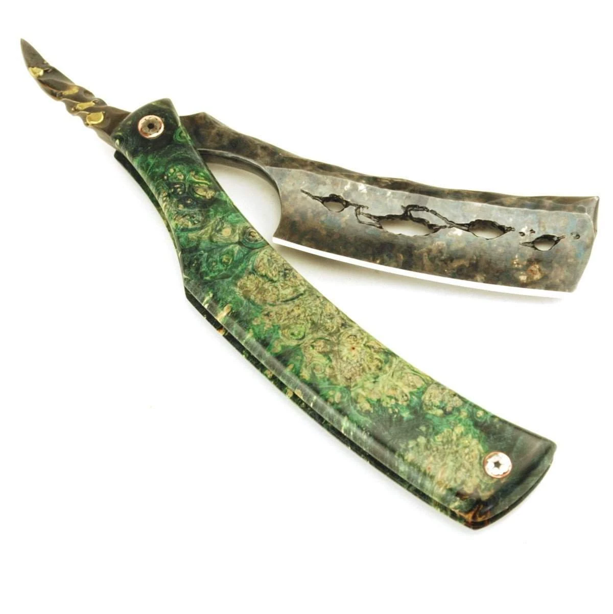 – Polished, stabilized box elder burl handle, dyed blue/green.