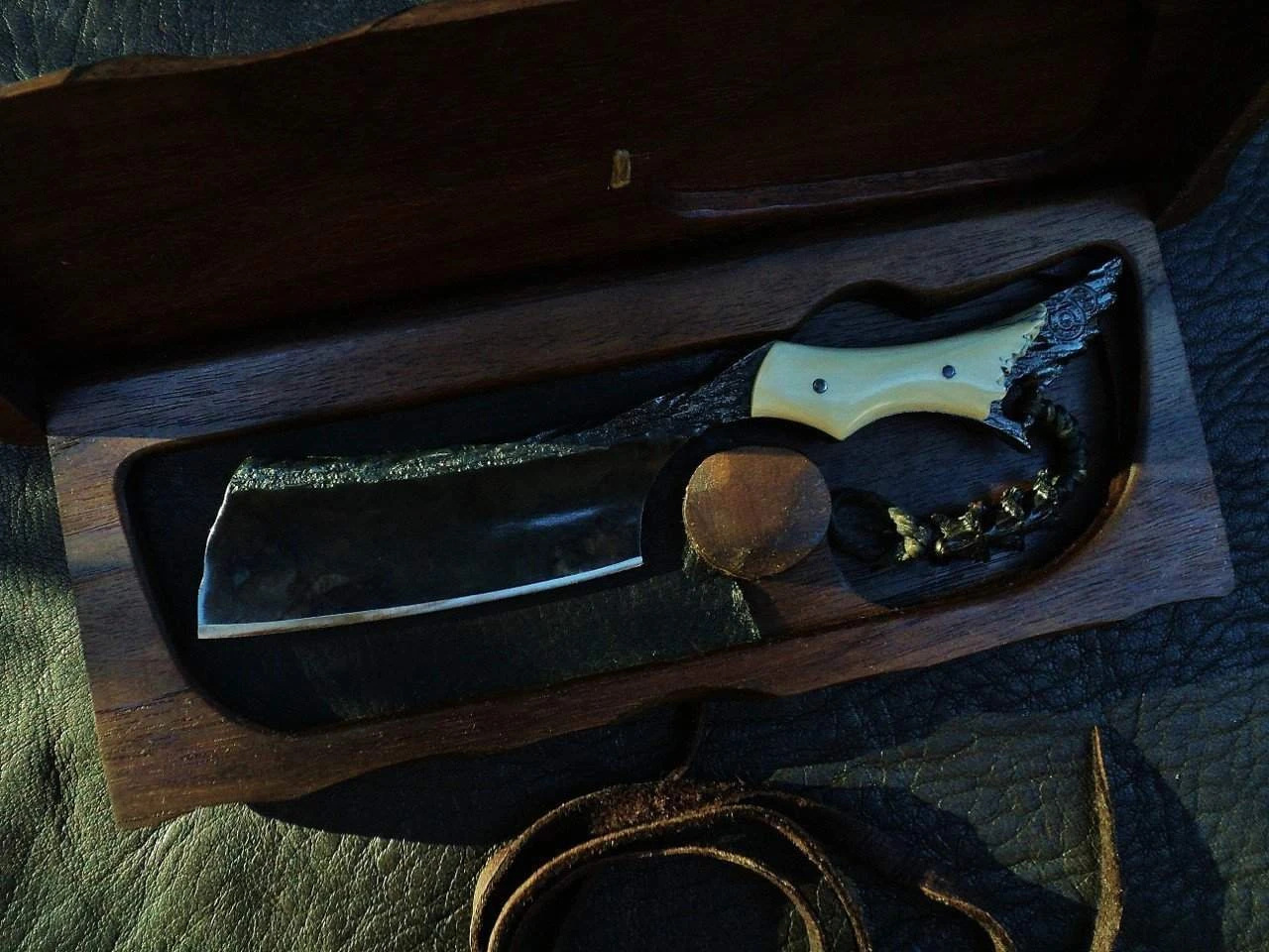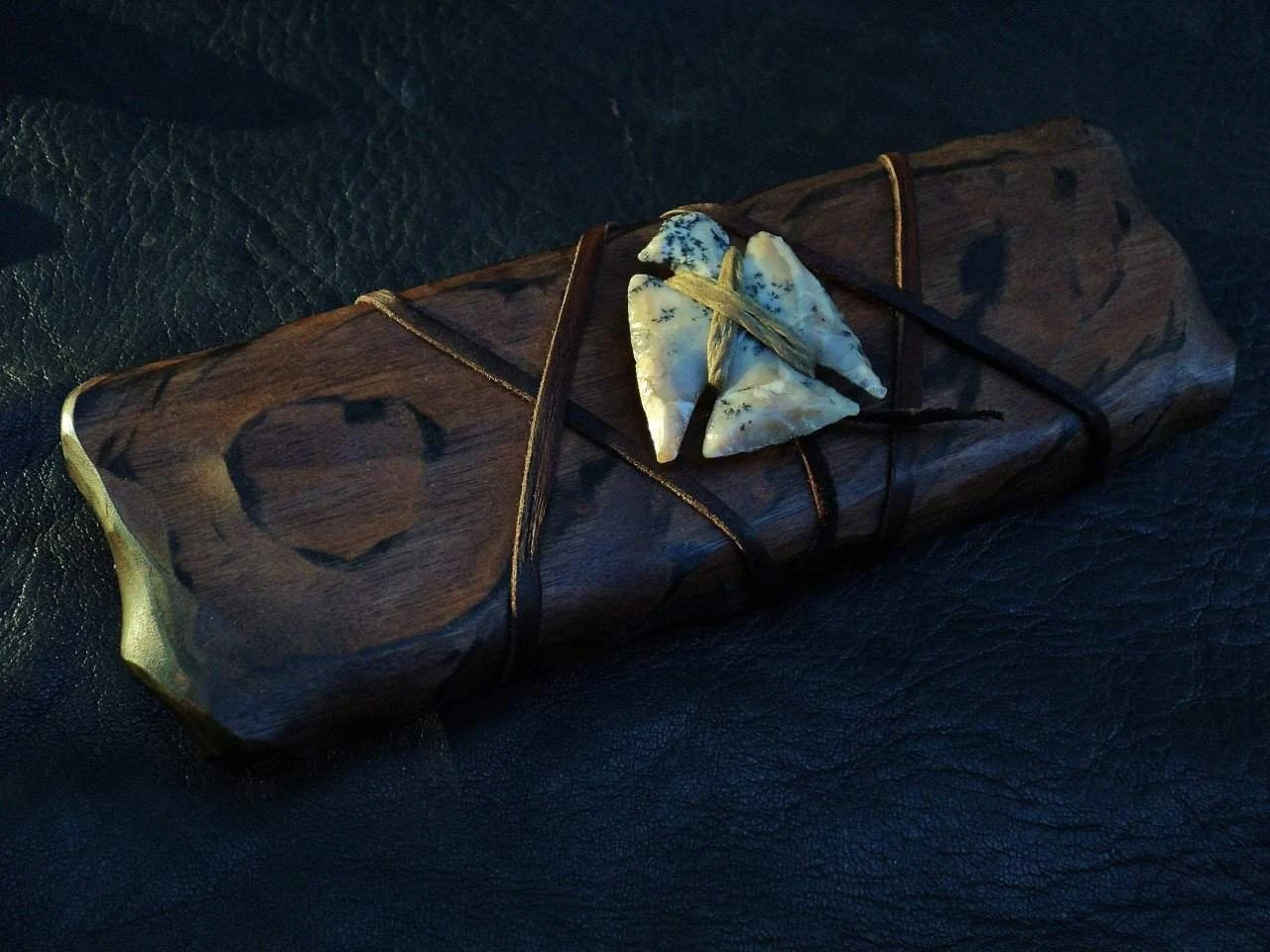 -Custom made black walnut box with hidden hinges, lace and hand-knapped stone closure toggle
