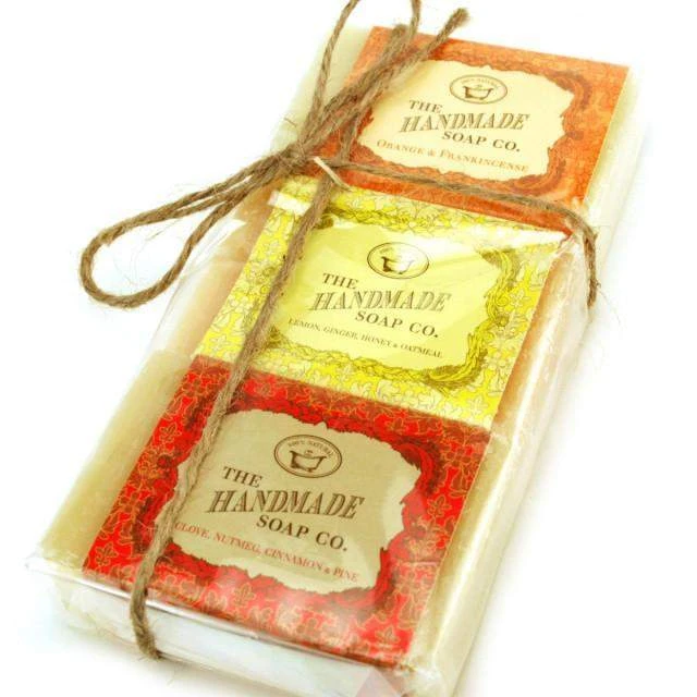 - Citrus – (300g) A three pack of citrus-scented soaps: Orange & Frankincense; Lemon Ginger Honey & Oatmeal; Clove Nutmeg Cinnamon & Pine