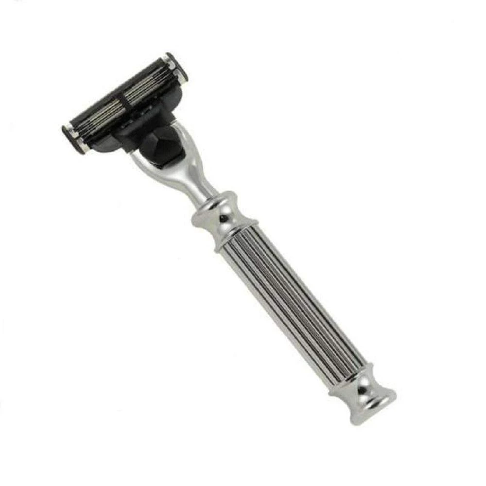 The Vintage Blades Brand Razor for Mach3 cartridges is a triple blade razor that is placed on a quality lathe turned or fluted aluminum handle. These razors are available in – Imitation Ivory, Ebony, and Fluted Chrome.